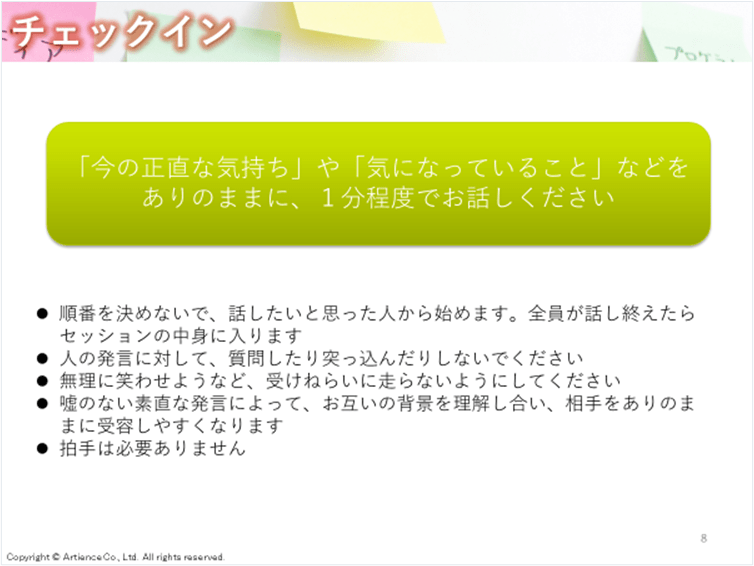 具体的なチェックインの進め方は、(10名程度まで)は全員が一言話してから、会議・ワークショップ・研修に入ります。
