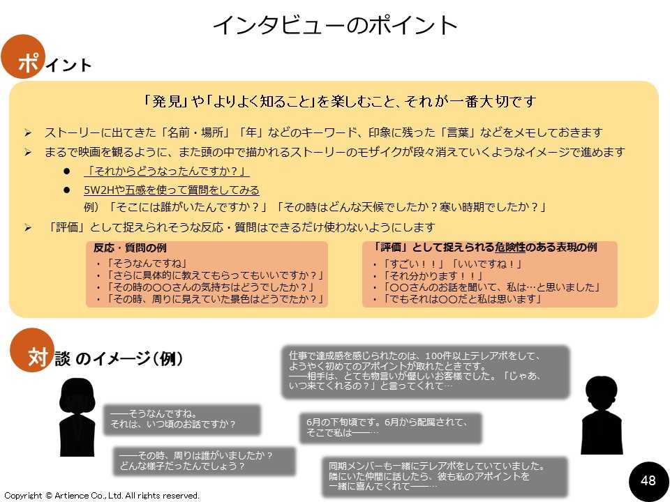 お互いのストーリーを深く知るため、理解が深まります。この際、インタビューシートの問いは、ポジティブな問いにしたほうがよいでしょう。