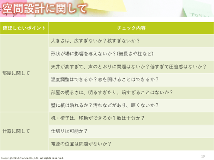 例えば、参加者の人数に対して明らかに大きすぎる部屋の場合は、寂しさがあり、場の活性度に影響を与えます。パーテーション等を用意してもらって、調整するといいでしょう。