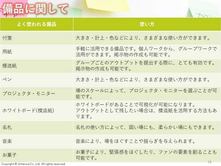 また、会議やワークショップの目的によって、必要な備品を利用します。