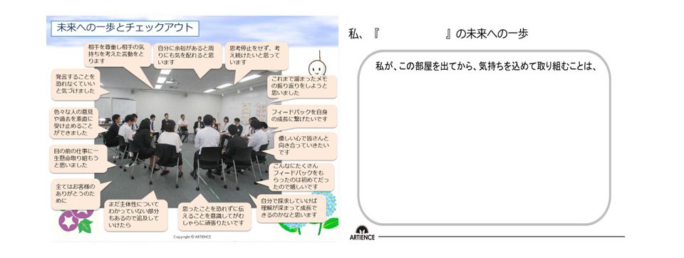 行動に向けて、まず、何を行うのかを『未来への一歩』にまとめます。最初に起こす行動を具体化することで、参加者の行動の質が上がります。