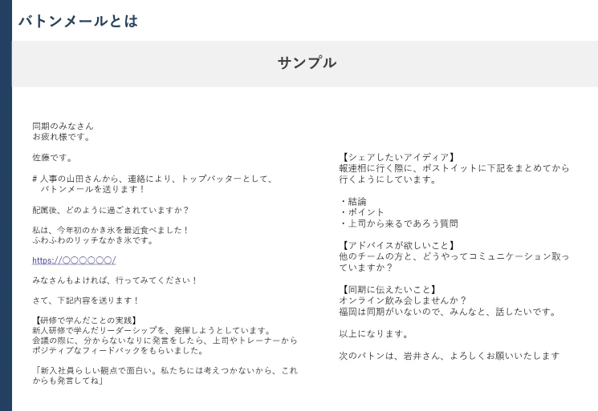 バトンのように、特定のグループの中でメールを回していく、会議・ワークショップ後のフォローツールです。(メール以外にも、グループチャット等での実施も可能です)