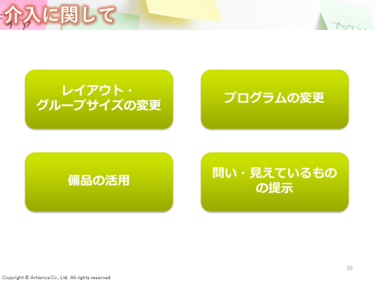 ファシリテーターはこれらをみながら、適宜必要な支援を行う必要があります。