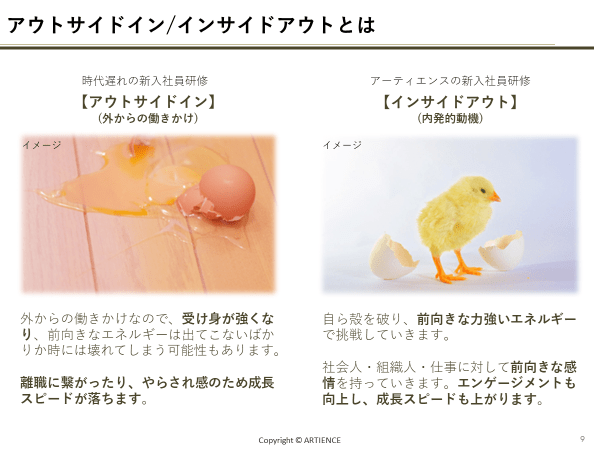 アーティエンスの新入社員研修は、自分の内側から意欲が湧き出す'インサイドアウト'の設計を重視しています。