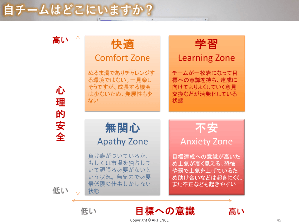 「心理的安全性」というワードが当時流行っており、取り入れようとしていましたが、その組織は、すでに心理的安全で言われる「ラーニングゾーン(※)」にいる状態でした。