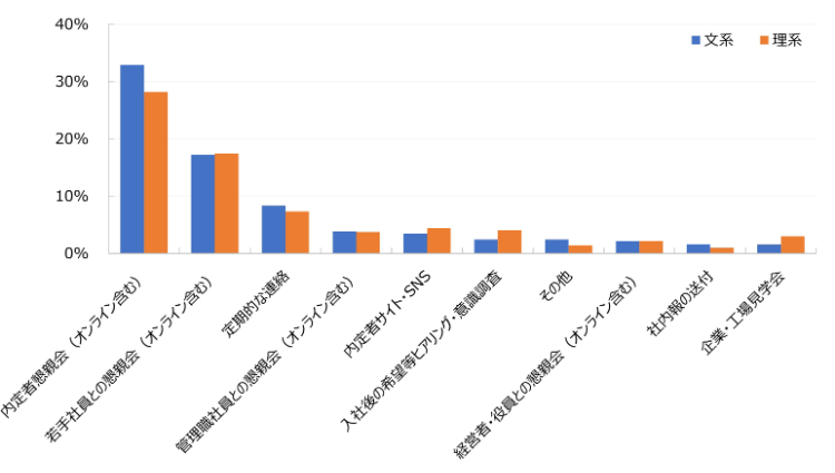 内定者と既存社員が交流する機会です。内定者の不安や気になっていることなどを気軽に質問できる環境を作れるかが大切なポイントです。