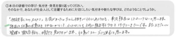 ①本日の研修での学び・気づき・発見を振り返ってください。その中で、あなたが社会人として活躍するために大切にしたい気づきや新たな学びは、どのようなことでしょうか。