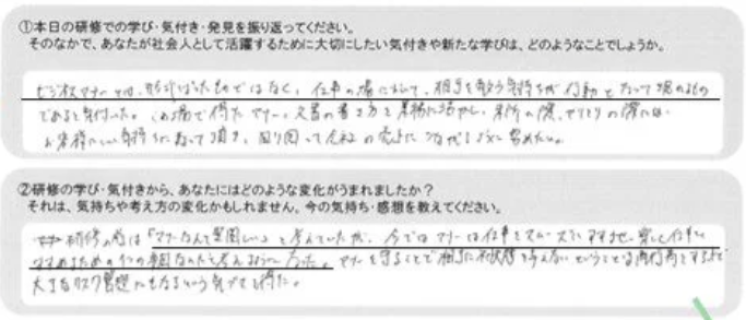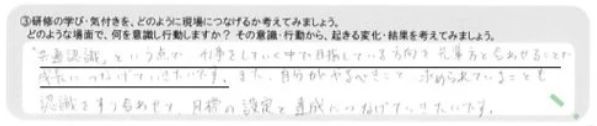 しかし、新入社員が記載している内容が、ラーニングポイントとズレている場合は、研修のポイントを受け取りきれておらず、研修の目的が達成できていない可能性が高いです。