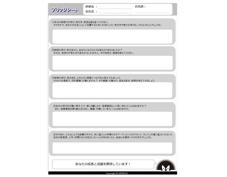 当社では、研修最後の数分をアンケート(ブリッジシート)の記載の時間に当てています。