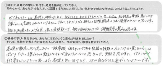 ②研修の前はマナーなんて堅苦しいと考えていたが、仕事をスムーズにすすませ、楽しく仕事をすすめるための1つの要因なんだと考えるようになった。(略)