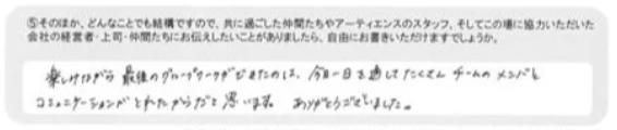 ⑤そのほか、どんなことでも結構ですので、共に過ごした仲間たちやアーティエンスのスタッフ、そしてこの場に協力いただいた会社の経営者・上司・仲間たちにお伝えしたいことがありましたら、ご自由にお書きいただけますでしょうか。