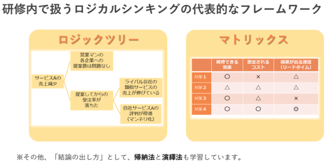 そこで、営業に欠かせない要素のひとつである「思考力(ロジカルシンキング)」を新入社員研修で重点的に鍛えるプログラムを導入。その結果、新入社員でも早期に成果を上げられるようになりました。