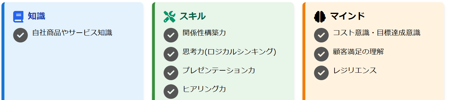 商品知識の理解、関係性構築力やヒアリング力、論理的思考やプレゼン力の習得に加え、コスト意識・顧客満足・レジリエンスといったマインドを養うことで、短期間で「信頼される営業」へと成長していきます。