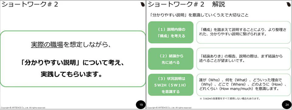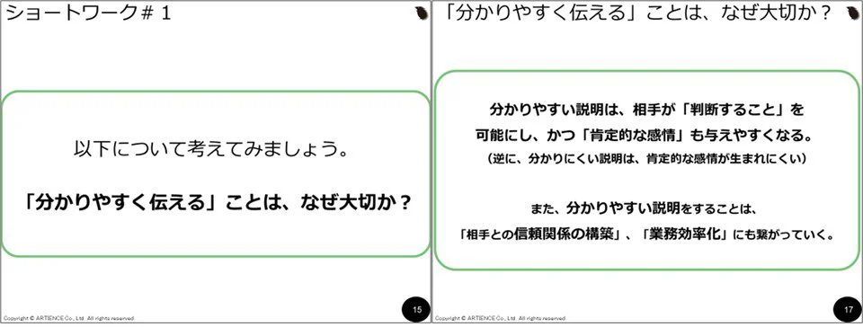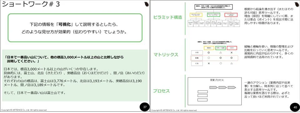 アーティエンスのプレゼンテーション研修では、ショートワークを通じて「わかりやすく伝える」ためのフレームワークや可視化手法を学びます。