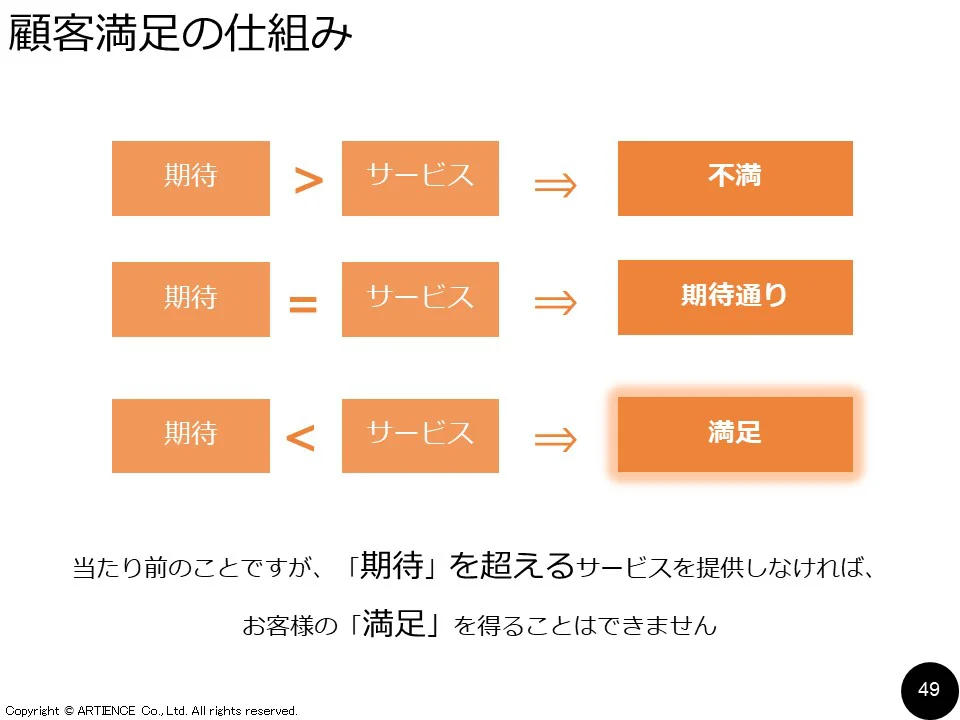 さらに、顧客満足の仕組みを解説した上で「満足度を高めるためにどんな準備や対応が必要か」をディスカッションします。