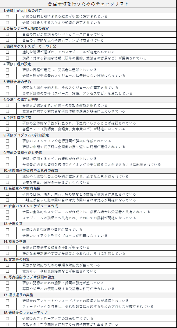 以下にこれまでの内容を元に、合宿形式の管理職研修を行うためのチェック表を作成しました。
