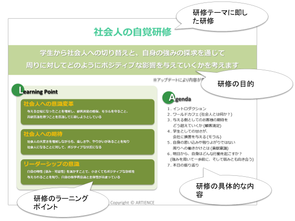 アーティエンスの社会人の自覚研修では、以下の3つのポイントについて学びます。