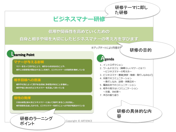 アーティエンスのビジネスマナー研修では、以下の3つのポイントについて学びます。
