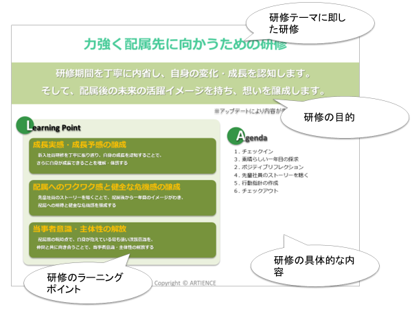 一方新入社員に行う場合は、「主体性を持って仕事を進めるためのマインドセット」といったテーマになるかもしれません。