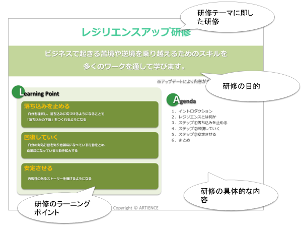 アーティエンスの困難を乗り越えるリーダーシップ開発コースでは、以下の3つのポイントについて学びます。