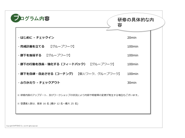 | メンバーのやる気を引き出し、主体的な行動を促すために必要なファシリテーションスキルについて実践的に学びます。 |