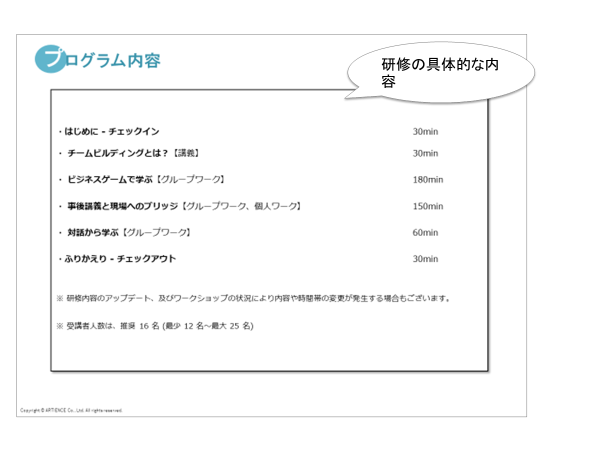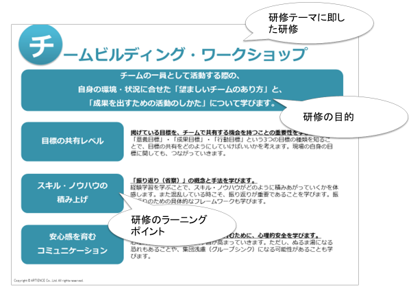 例えば、「コンフォートゾーン(ぬるま湯)から脱却するチーム創り」が課題である場合、単なるスキルトレーニングではなく、心理的安全性を確保しながらもチームで切磋琢磨できる環境をつくるための研修が必要になります。