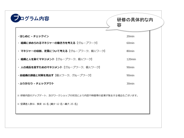 そのため、研修後にどのような言動が起こると良いか、という行動目標も設定しておくことをおすすめします。