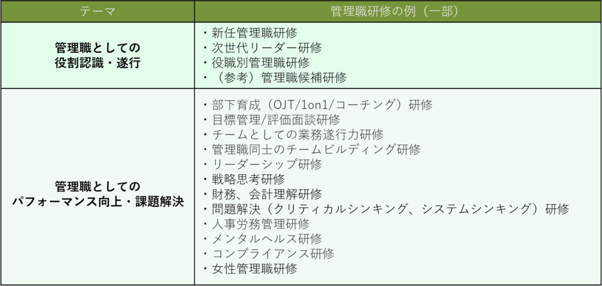 例えば、「管理職が心理的安全を保ちながらも、チームで切磋琢磨するための知識とスキルを習得する」という目的がある場合、管理職向けには「管理職としてのパフォーマンス向上・課題解決」といったテーマが適切です。