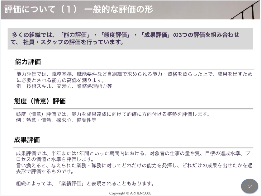 この考えのもと、例えば、アーティエンスの管理職基礎研修では、評価の基本的な考え方を学び、評価を育成につなげるための関わり方をワーク形式で習得します。