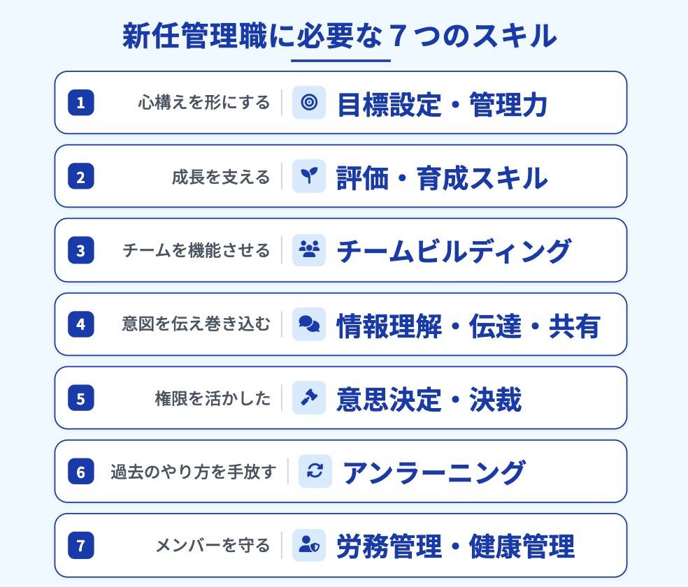 新任管理職が管理職の心構えを仕事に落とし込む際に必要なスキルを7つ紹介します。