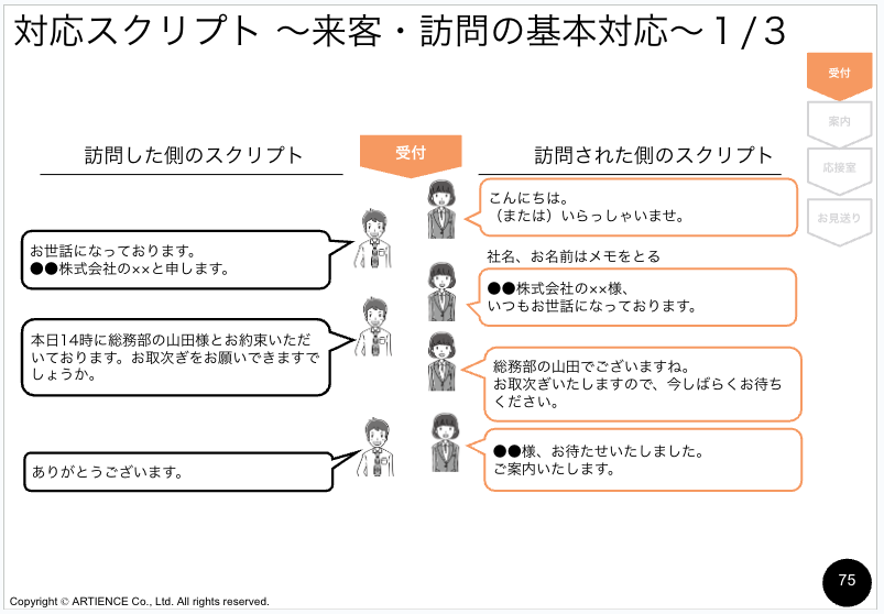 例えば、来客・訪問対応で必要となる名刺交換や受付の対応、部屋への案内や見送りなどを、受講者同士が役割を交代しながら練習します。
