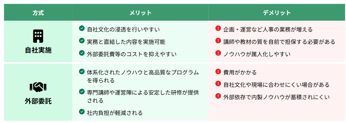 外部委託には、プロ講師による高品質なプログラムや設計・運営の負担軽減、第三者視点のフィードバックといった大きなメリットがあります。一方で自社実施には、自社の文化や業務のリアリティを反映できる強みがあります。