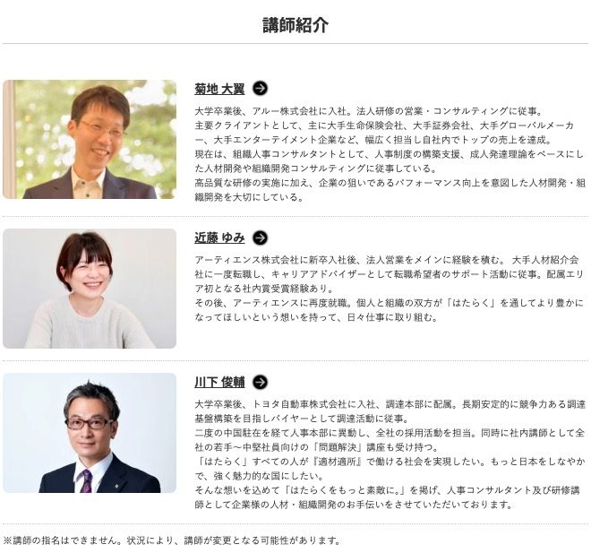 このように講師としての登壇実績だけでなく、研修に対する想いを確認することで講師の品質を知れます。