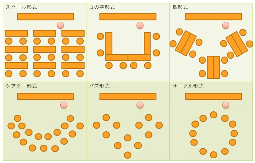 たとえば、グループワークが多い研修であれば、「島形式」が適しています。一方的な講義型なら「スクール形式」や「コの字型」でも問題ありません。