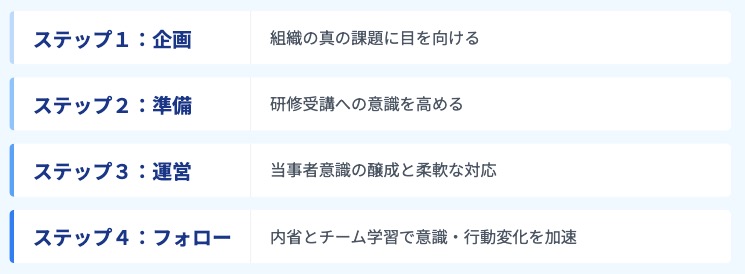 管理職研修の効果を高めるには、「企画 → 準備 → 運営 → フォロー」のプロセスを一貫したストーリーで設計することが重要です。