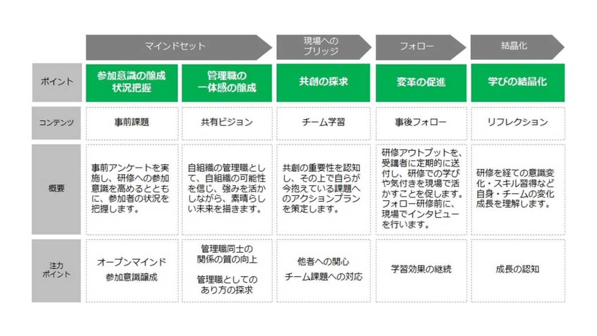 管理職に必要な役割は多岐にわたるため、すべてを詰め込むのではなく、自社で特に重視したい役割(例:部下育成、チームで成果を出す、経営方針を自分ごと化する 等)に絞り、その役割を果たすための「意識」と「基本スキル」を扱うことがポイントになります。