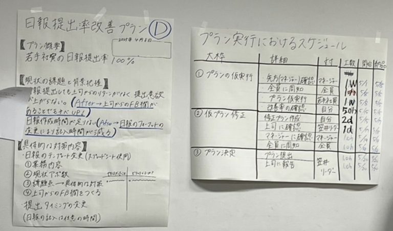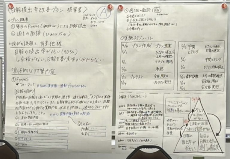 前日に学んだビジネススキルを活かし、アウトプットを明確にするために5W2Hで要件を整理した上で、課題をタスクに分解し、スケジューリングを実施。そのうえで、Big Whyを用いて解決策を深掘りするという一連のプロセスを実践できていました。