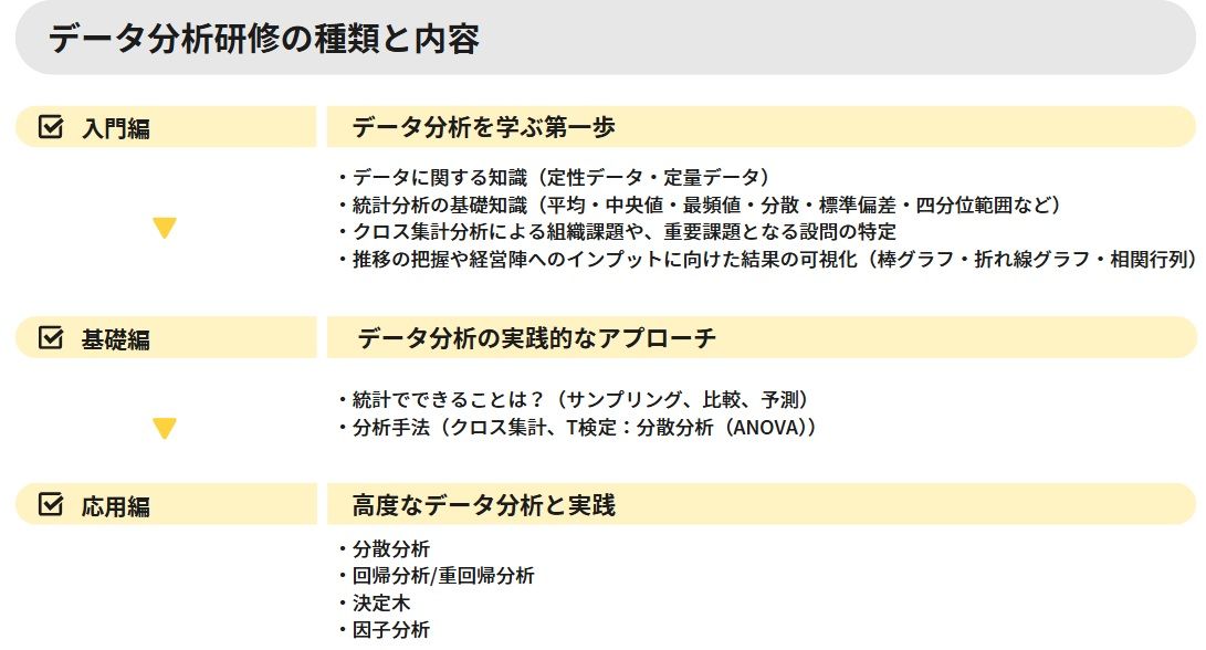 世の中のデータ分析研修は一般的に入門編・基礎編・応用編の3種類があります。