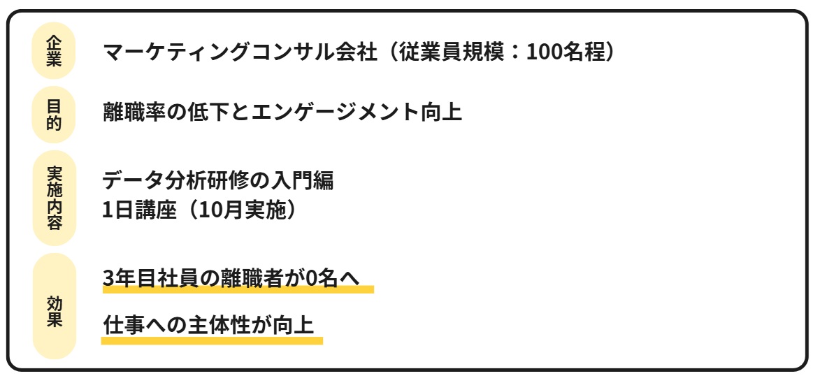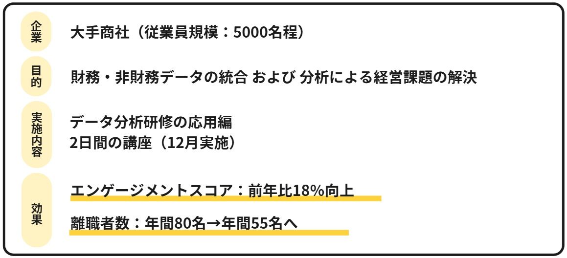 データ分析研修は「意思決定の質を上げること」ができる、非常に強力な研修です。意思決定の質が上がれば、経営判断・現場判断もよりよくなり事業も組織も成長します。