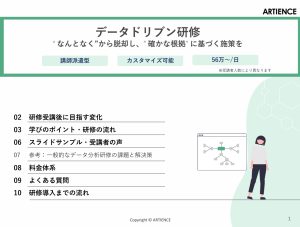 本コラムでご紹介したデータ分析研修を提供しておりますので、ご興味があればぜひアーティエンスまでご連絡ください。貴社にあわせた内容にて、ご提案いたします。