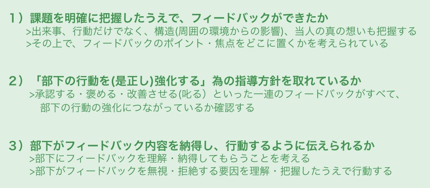 このワークを踏まえ、部下へのフィードバックで大切なこととして以下の3点をお伝えしています。