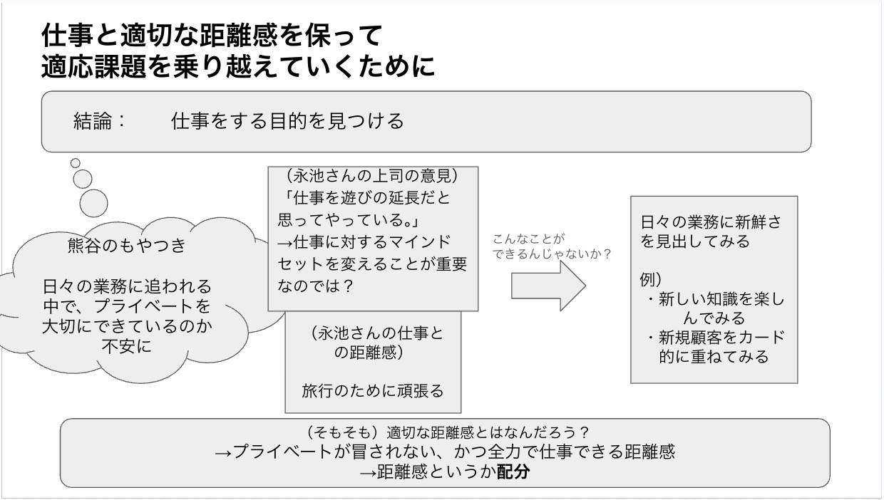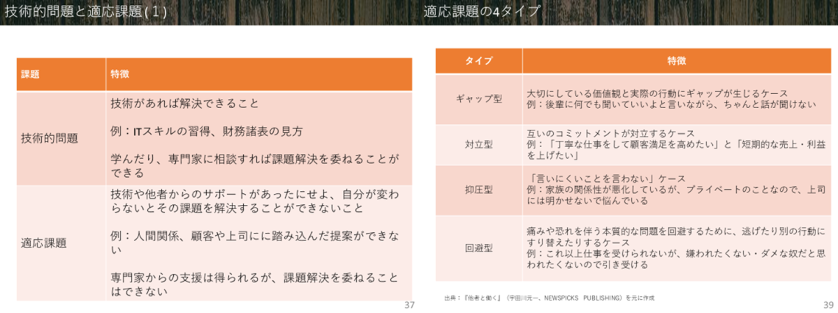 次に「成人発達理論」の枠組みを基に、技術的問題と適応課題について自身と向き合う時間を設けました。個人ワークで自身の課題と向き合った後に、グループで対話を行います。