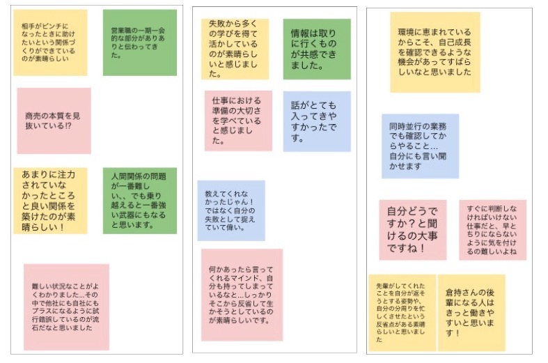 ・自分から話を聞いて要件をまとめたり、質問にしっかり答えてコミュニケーションを増やした点は「いいね」と言ってもらえた。意識して取り組んでいたところだったから、ちゃんと見てくれているんだなと感じられて嬉しかった。