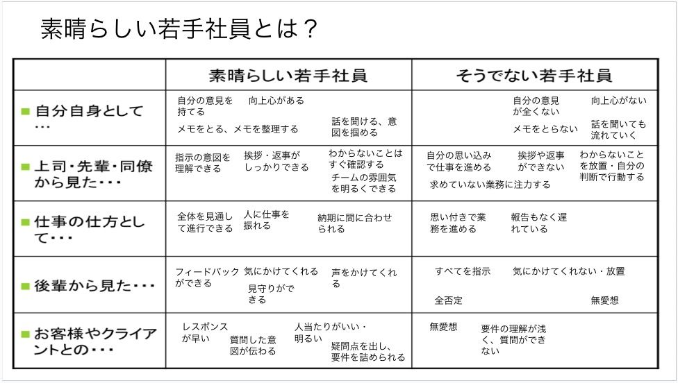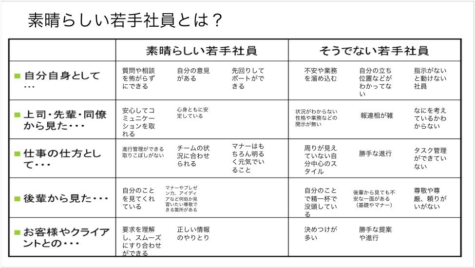 「素晴らしい3年目社員/そうでない3年目社員ってどんな感じなんだろう?」を考えて、グループで対話を行いました。