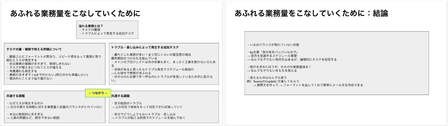 参加者の皆さんがリアルな課題を真剣に持ち寄り、互いの経験や視点を重ねながら具体的な解決策を模索していた姿がとても印象的でした。