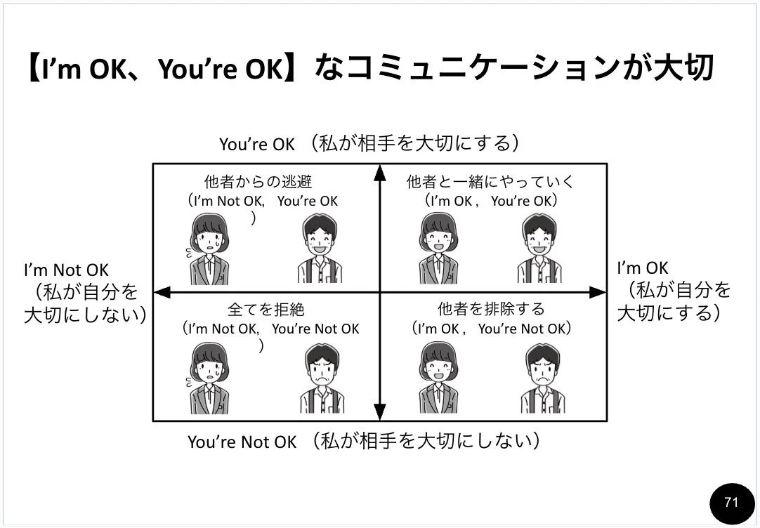 | ③ アサーティブ・コミュニケーションを学ぶ機会を設ける | 主張と配慮のバランスを学び、率直かつ建設的に意見交換できる関係性をつくる |