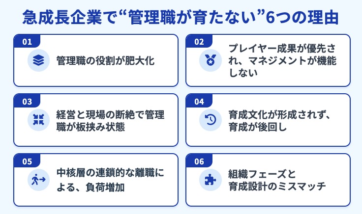 このように急成長企業で管理職が育たなくなる背景には、相互に絡み合った構造的な要因があります。