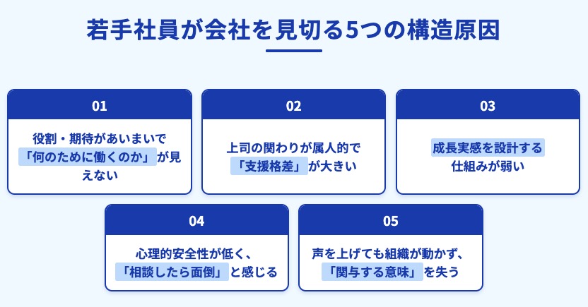 若手社員が会社を見切る前に、組織の中で何が起きているのかを、5つの構造原因に分けて整理します。