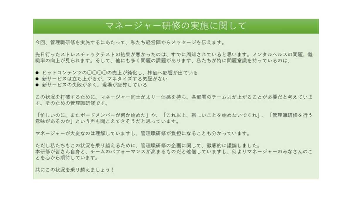 なぜこの研修が必要なのかというと、多くの新任管理職が「何をどう進めたらよいかわからない」という不安を抱えながらスタートを切るためです。