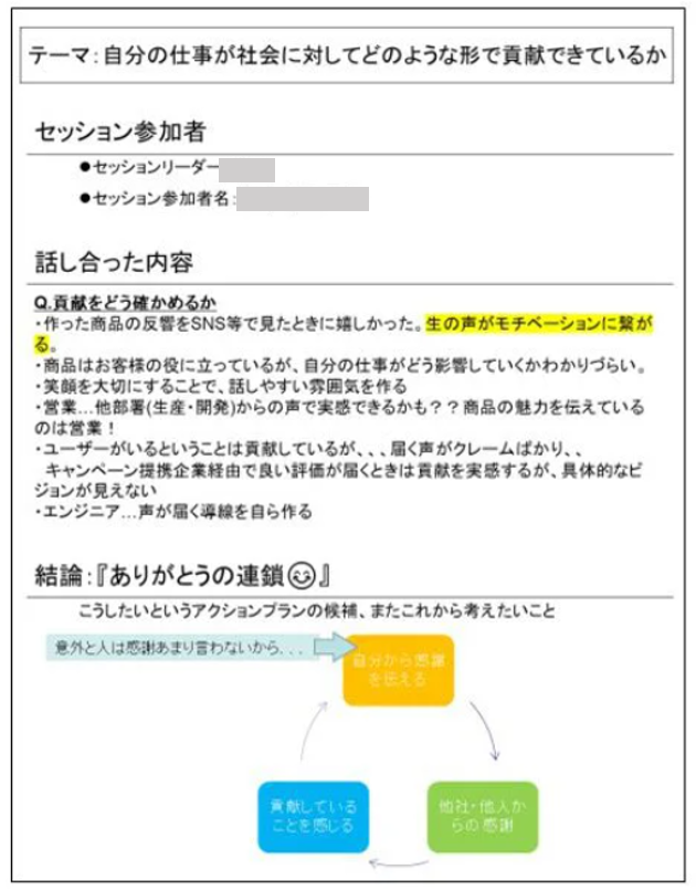貢献をどう確かめるかということから考えていき、生の声が仕事のモチベーションにつながるという意見が出てきたため、自分から周りを幸せにするような行動を始めるといいのではないかという話になりました。自分から、感謝の気持ちを伝えていくことで、巡り巡ってありがとう、という連鎖を作り出すことができ、自分の仕事自体への感謝の気持ちも湧いてくるのかなと思いました。